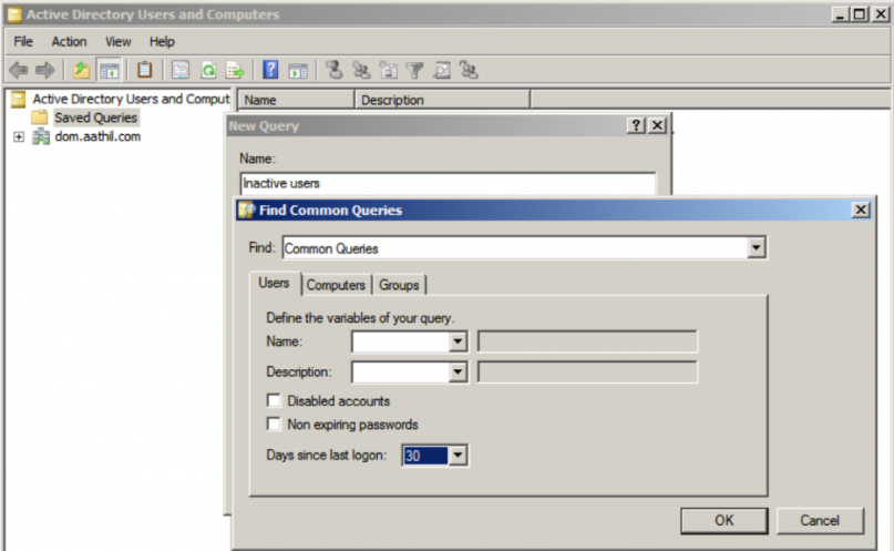 Microsoft允许管理员使用用户和计算机(ADUC)工具中的查询功能来跟踪不活动用户。管理员可以创建一个查询,并根据上次登录时间设置该账户闲置情况,如图1所示。
